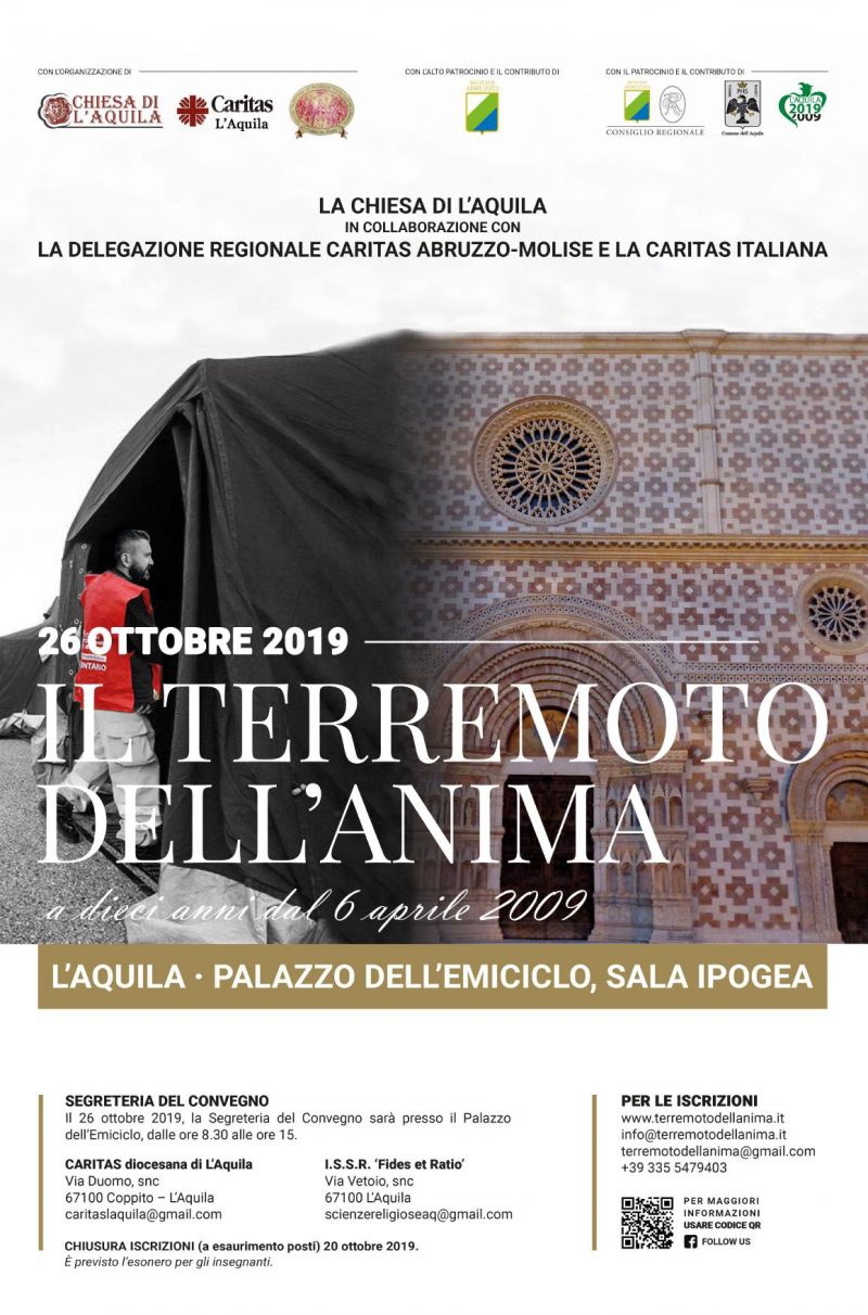Nel decennale del terremoto del 2009, la Chiesa aquilana in collaborazione con la Caritas Italiana, grande protagonista nel territorio aquilano nei giorni e nei mesi successivi al 6 aprile 2009 nel portare conforto e fattiva assistenza ai terremotati, ha deciso di promuovere un Convegno nazionale sabato 26 ottobre 2019 dal titolo: ‘Il Terremoto dell’Anima, a dieci anni dal 6 aprile 2009’. Il Convegno sarà dedicato all’approfondimento dei risvolti di natura spirituale e psicologica che le catastrofi che hanno interessato il centro Italia nel decennio trascorso, hanno prodotto nelle comunità colpite dal sisma.