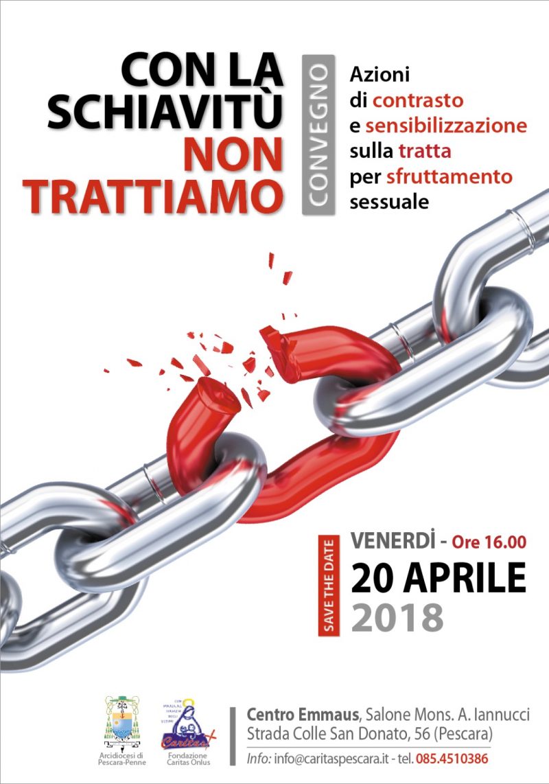 Il convegno “Con la schiavitù non trattiamo” si pone l’obiettivo di riflettere sul tema della tratta per sfruttamento sessuale. L’incontro nasce a seguito del progetto Tratti-amo della Fondazione Caritas, finanziato dai fondi 8xmille, nel quale si è sviluppato un lavoro di formazione e sensibilizzazione rispetto al mondo della scuola, delle comunità parrocchiali e delle Caritas di Abruzzo e Molise. L’attività di sensibilizzazione è stata accompagnata da interventi di prevenzione e accoglienza sul territorio della Città di Pescara e zone limitrofe.